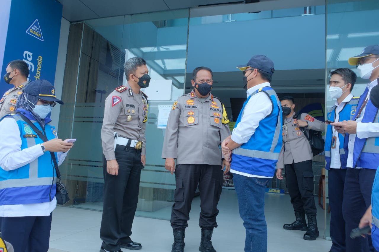 Baraknews Polda Jabar–Kapolda Jabar Irjen Pol. Drs. Suntana M.Si melaksanakan pengecekan arus lalu lintas dan kepadatan jalan serta pelaksanaan one way di KM 70 Kantor Jasa Marga, Gerbang Tol Cikatama, Sabtu (30/4/2022).