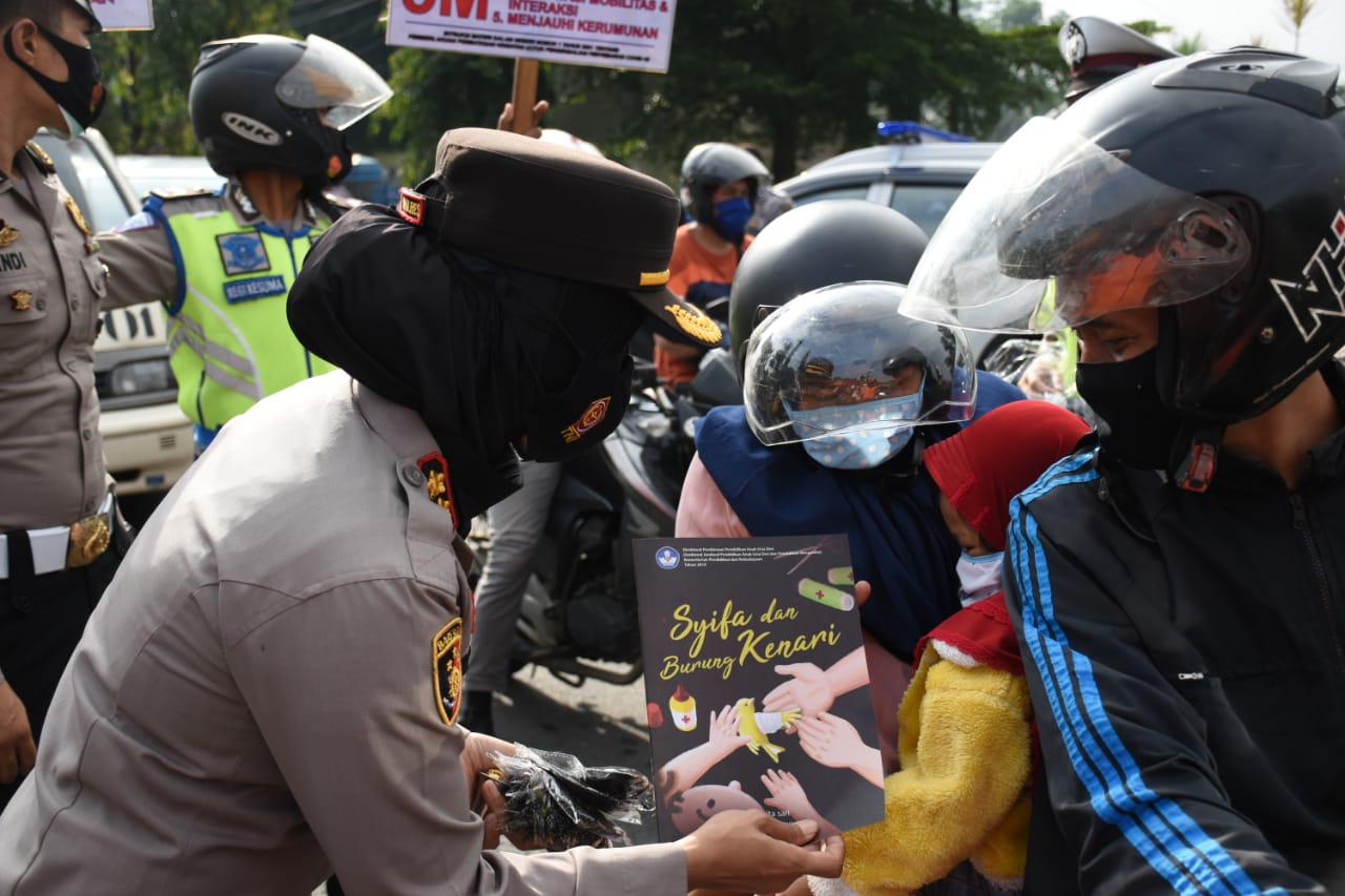 Selain membagikan masker, Kapolres Banjar membagikan buku cerita bergambar untuk anak-anak, buku dibagikan secara gratis kepada pengguna jalan yang juga membonceng anak-anak.