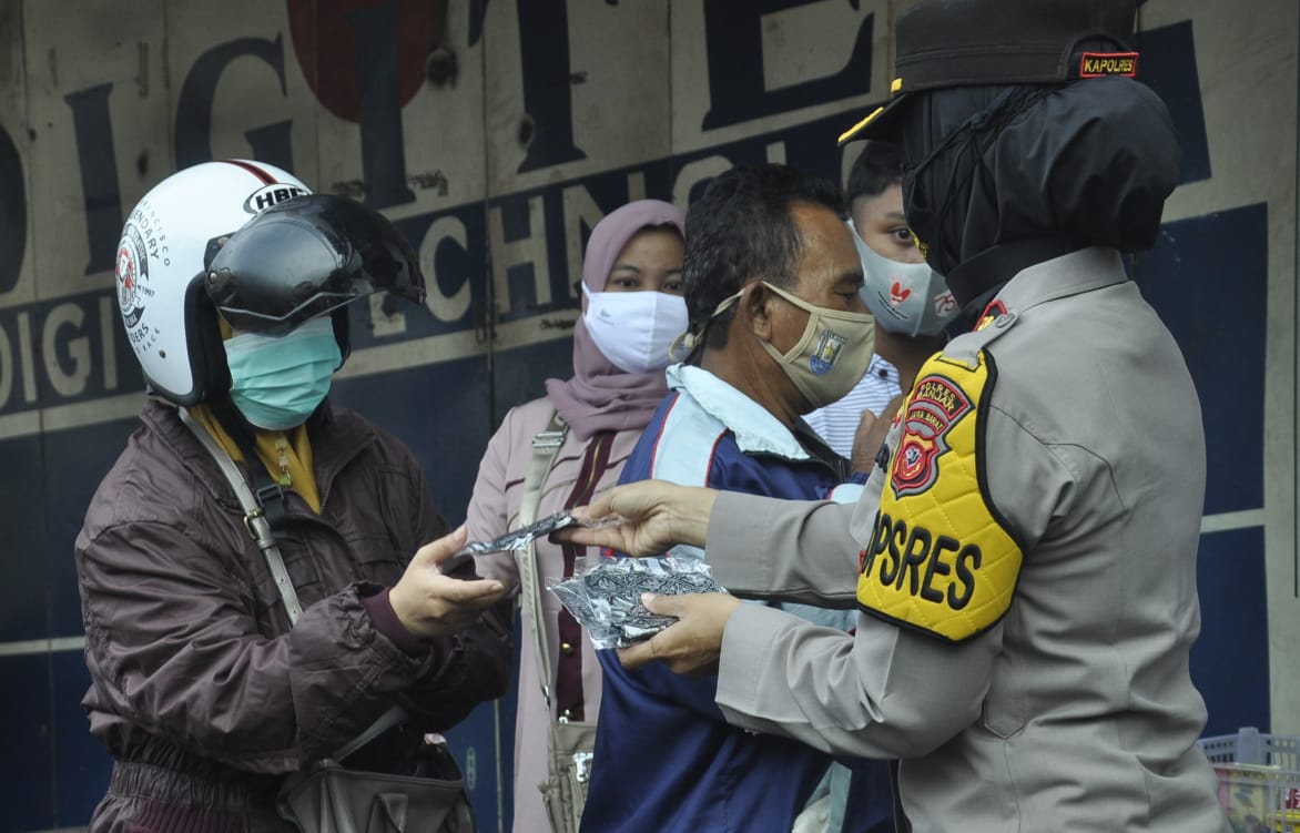 Kali ini Kapolres Banjar menghampiri langsung para pengguna jalan yang ditemui di Jalan-jalan protokol kota Banjar dan bagikan masker.