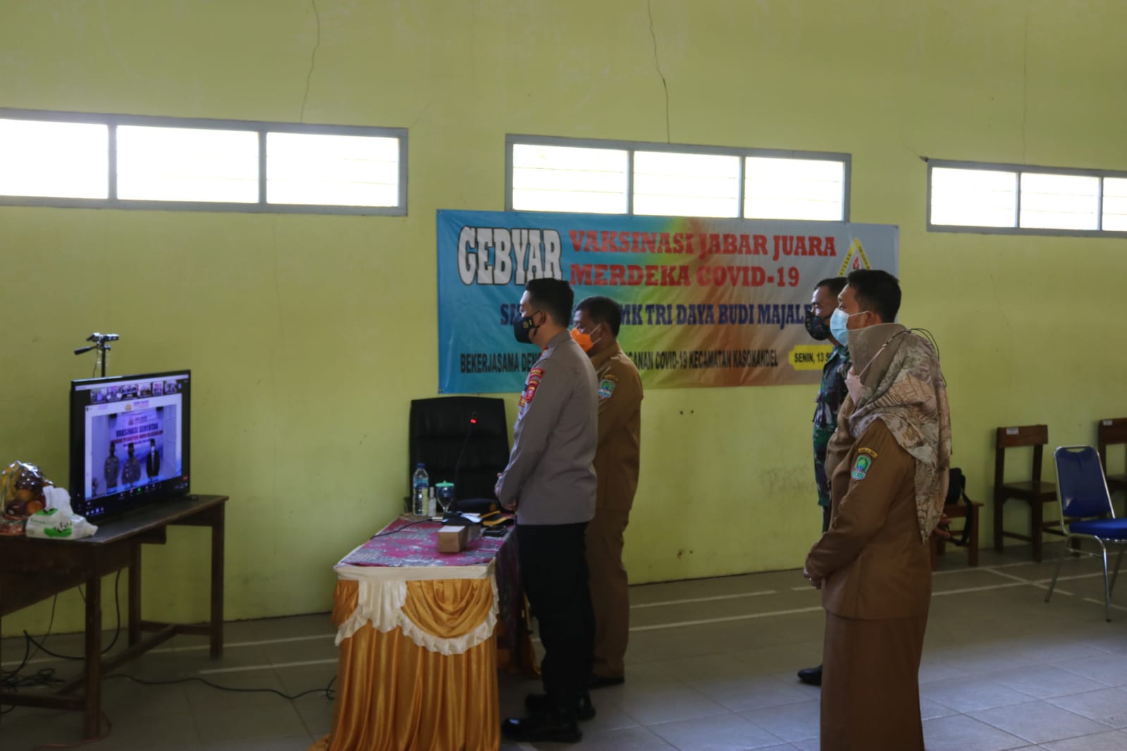 Kapolres Majalengka AKBP Edwin Affandi, didampingi Sekda Kabupaten Majalengka H. Eman Suherman, Kapolsek Kasokandel, Danramil Dawuan, Kasi Dokkes, hadiri zoom meeting bersama Kapolri tentang Vaksinisasi massal diwilayah hukum Polres Jajaran.