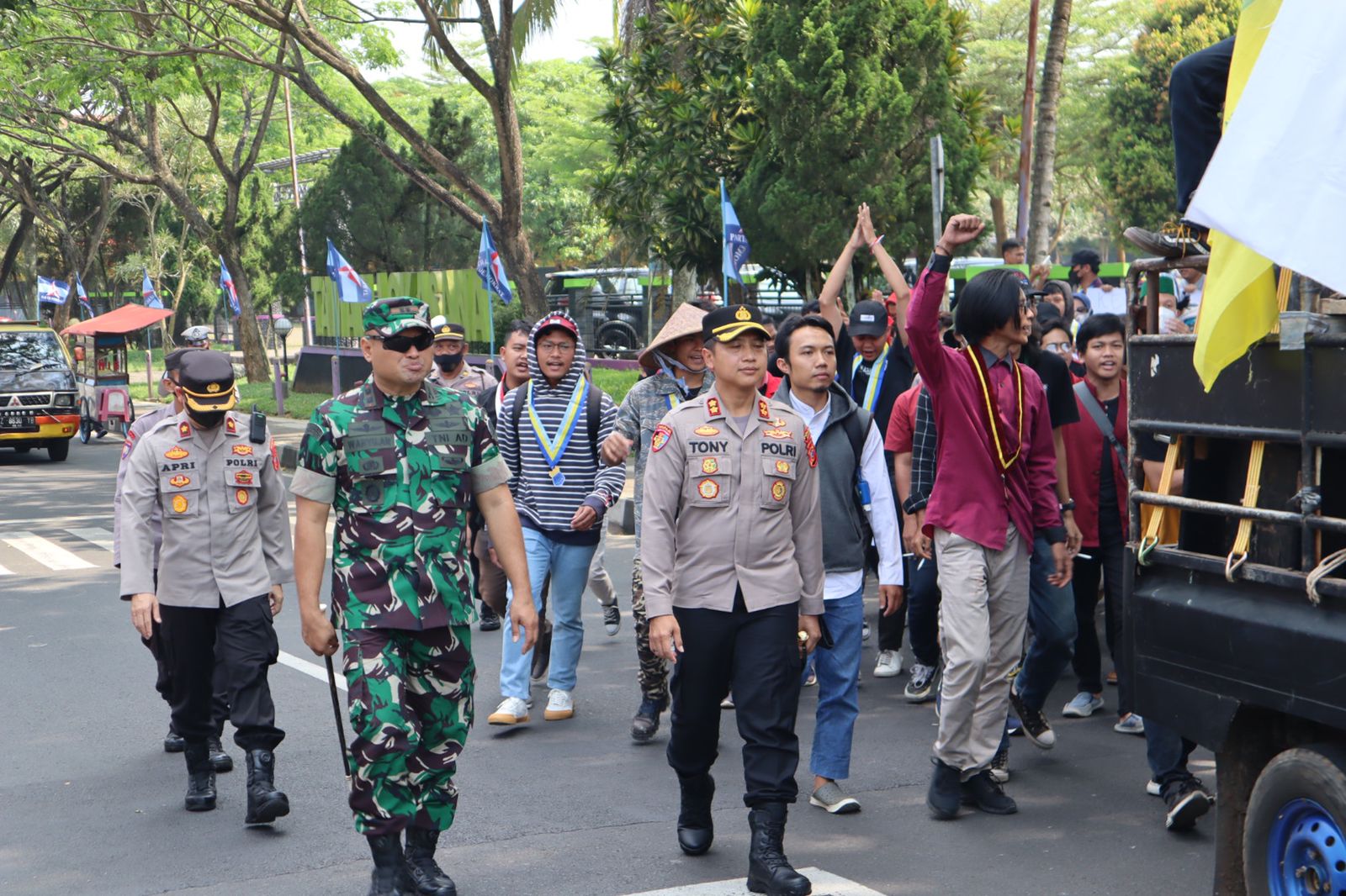 Saat long march, Kapolres Ciamis bersama Dandim 0613/Ciamis mendampingi puluhan mahasiswa yang tergabung dalam Aliansi Mahasiswa Melawan.