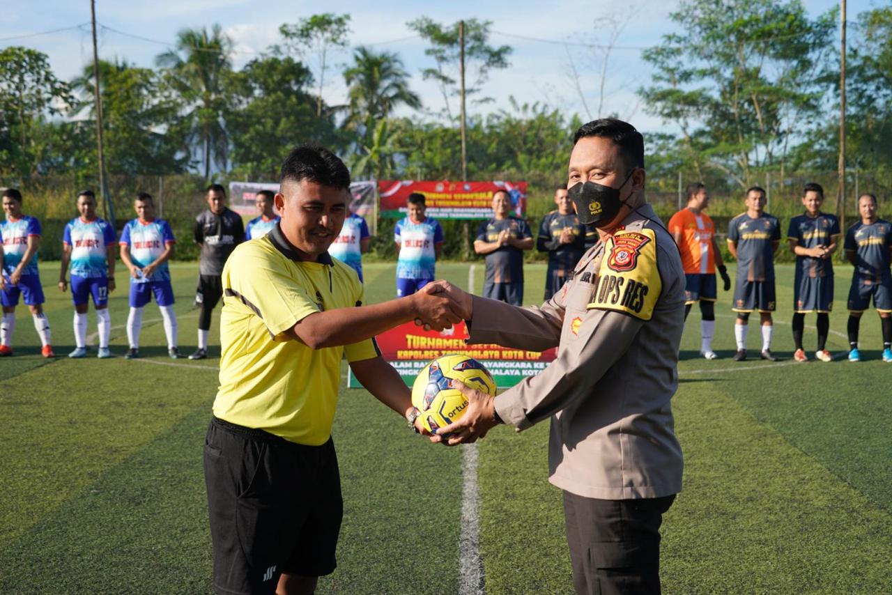 Kapolres Tasikmalaya Kota AKBP Aszhari Kurniawan, S.H., S.I.K., M.Si. berkenan membuka acara Turnamen Mini Soccer yang digelar untuk memeriahkan HUT Bhayangkara Ke-76.