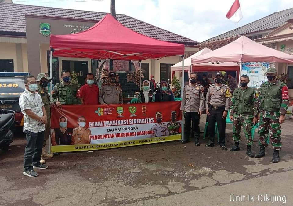 Berita Polres Majalengka, –Kapolsek Cikijing Polres Majalengka Kompol Toto Sumarto, didampingi anggota Polsek Cikijing dan anggota Koramil 1705/CKJ melaksanakan monitoring pelaksanaan vaksinasi Covid-19 di Gerai Sinergitas Vaksin Presisi yang berlokasi di halaman balai Desa Cisoka, Senin (5/07/2021).