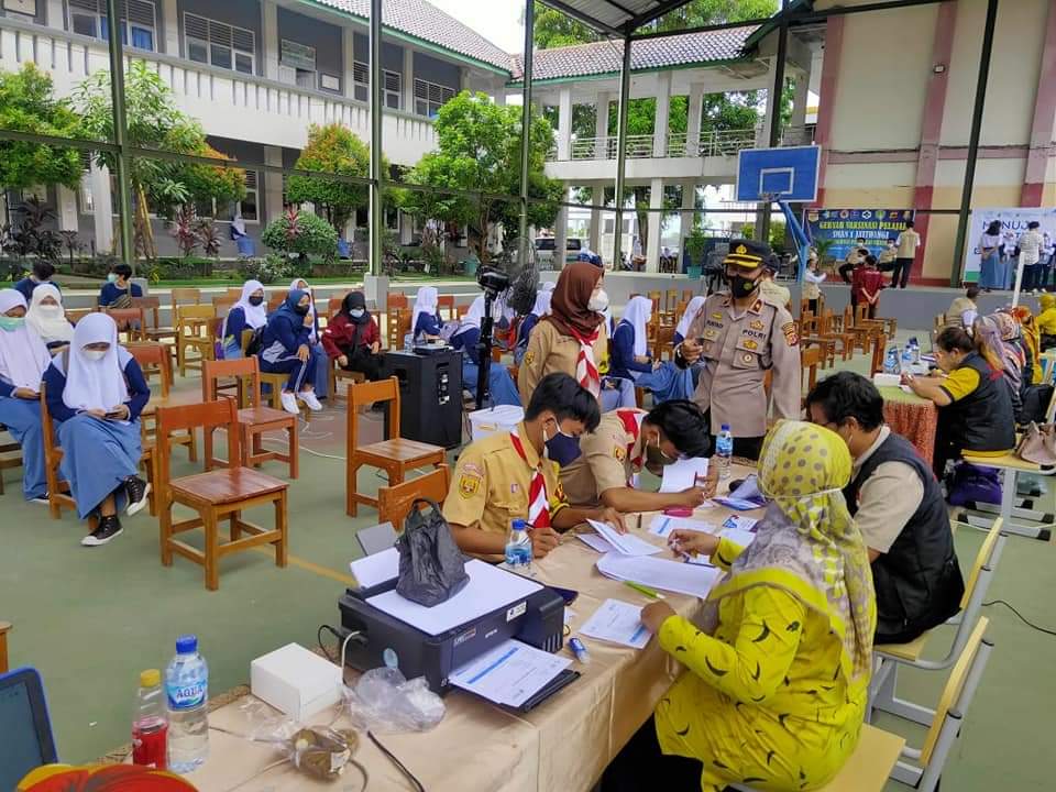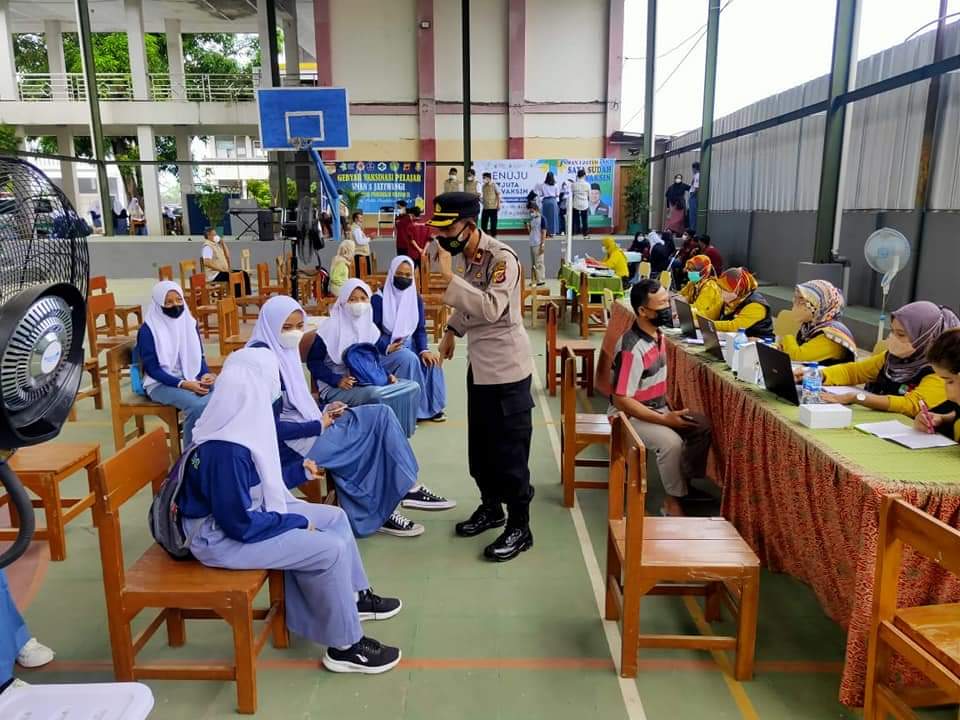 Berita Polres Majalengka--, Kapolsek Jatiwangi Polres Majalengka KOMPOL Kustadi beserta anggota memantau langsung pelaksanaan vaksinasi bagi siswa siswi SMAN Jatiwangi Kabupaten Majalengka, Sabtu (18/9/2021).