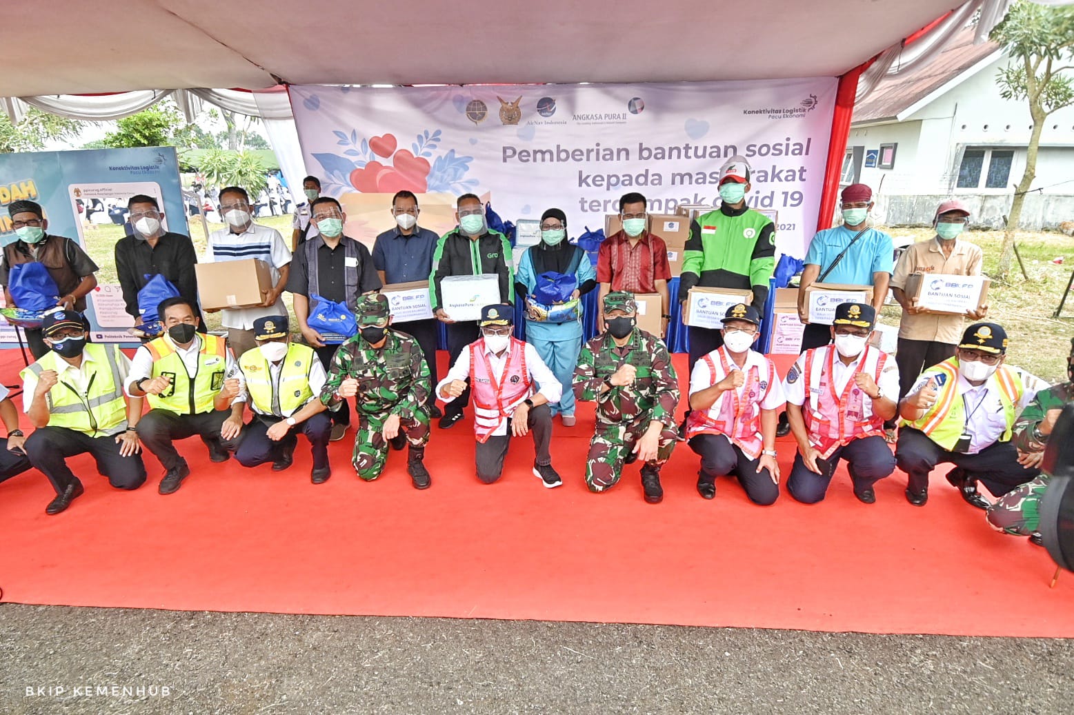 Selain menggelar vaksinasi, Kemenhub bekerjasama dengan TNI AU, Airnav Indonesia, dan PT Angkasa Pura I, PT. Angkasa Pura II, PT. Airnav Indonesia juga membagikan bantuan sosial berupa 600 paket sembako kepada masyarakat sekitar yang terdampak ekonominya akibat pandemi.
