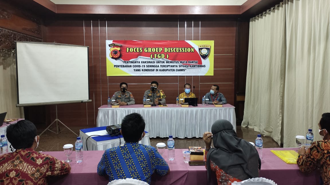 Berita Polres Ciamis – Kepolisian Resor Ciamis Polda Jabar menggelar Forum Discussion Group (FGD) bersama para relawan sosial gerakan pentingnya vaksinasi Covid-19. Acara terebut digelar di Aula Hotel Tyara Ciamis, Kabupaten Ciamis, Jawa Barat, Kamis (24 Juni 2021).