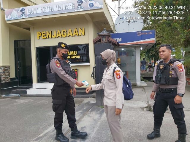 Baraknews Polres Kotim – Polres Kotim (Kotawaringin Timur) jajaran Polda Kalteng mewajibkan personilnya cek suhu badan sebelum memasuki lingkungan Mako di depan pintu gerbang Mapolres setempat Jalan Jenderal Sudirman Km 0 Sampit Kab.Kotim Prov.Kalteng, Rabu (15/03/2023) pagi.