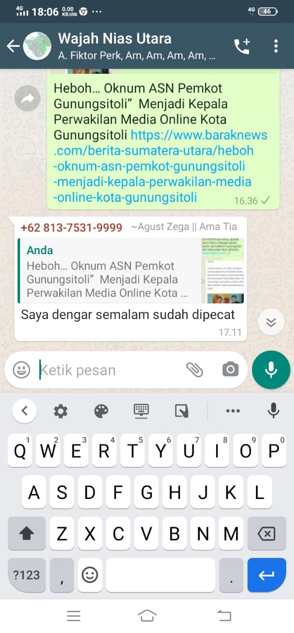 Berita Gunungsitoli,- salah satu Oknum ASN kota Gunungsitoli lontarkan komentar diduga Hoax di grup Whatsapp Wajah Nias Utara setelah membaca pemberitaan tentang ” Hebohnya,,,Oknum ASN Pemkot Gunungsitoli ” menjadi kepala perwakilan media online kota Gunungsitoli, Minggu 14/06/2020.