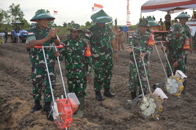 Dalam peninjauannya Pangdam XVII/Cenderawasih yang didampingi oleh Danrem 174/ATW Brigjen TNI E. Reza Pahlevi mengunjungi lahan ketahanan pangan yang dibuka Korem 174 dan tatap muka dengan kelompok tani Distrik Tanah Miring serta melakukan penanaman jagung bersama para petani dilahan pertanian kampung sumber harapan (Sp3) Distrik Tanah Miring.