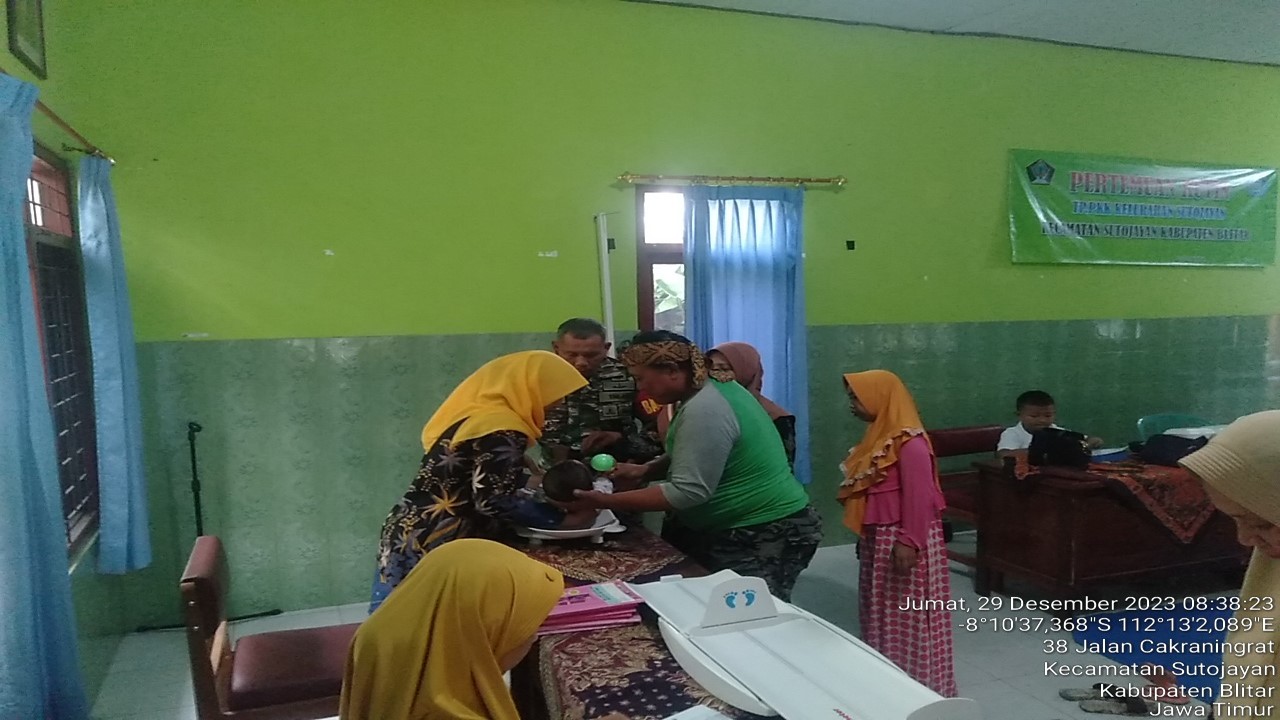 Kodim Blitar – Sebagai wujud kepedulian terhadap kesehatan anak, Babinsa Koramil 0808/09 Sutojayan Kodim 0808/Blitar Serka Mutadin, melaksanakan kegiatan pendampingan Posyandu Balita dan pengecekan kesehatan anak penderita stunting oleh Bidan Desa, yang bertempat di Balai Pertemuan Kel. Sutojayan, Kec. Sutojayan Kab. Blitar, Jumat (29/12/2023).
