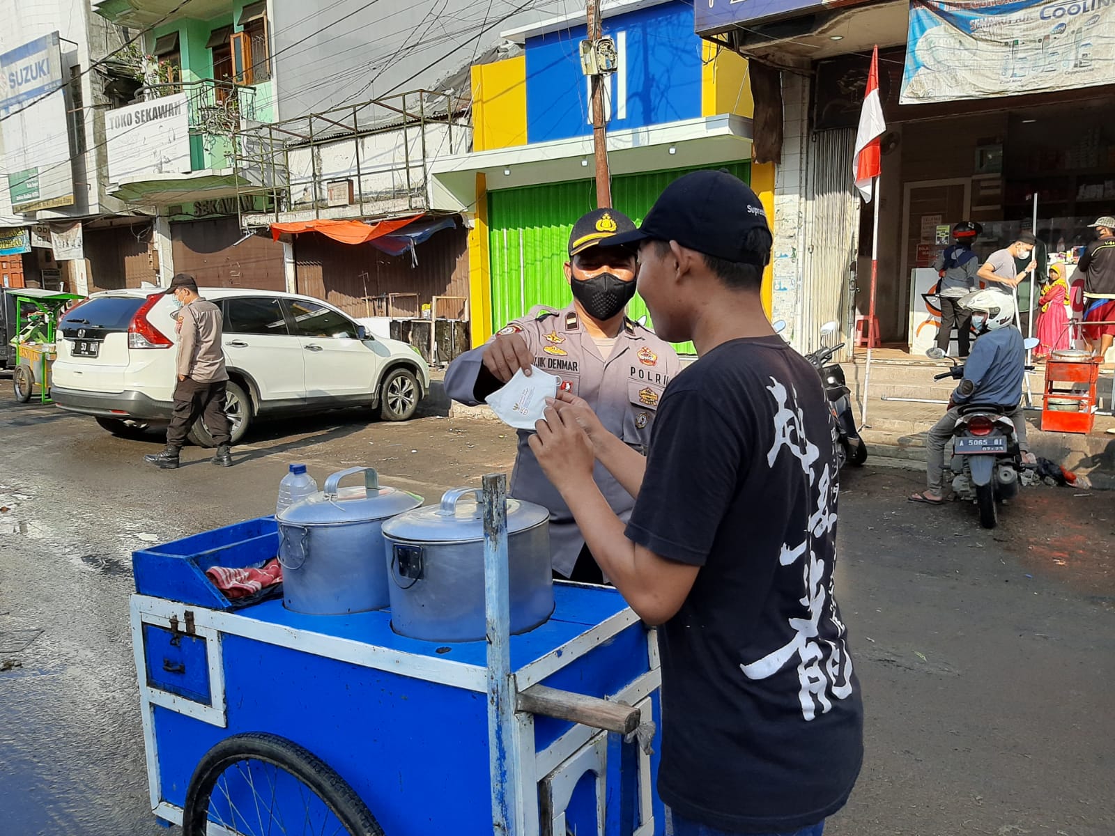 Berita Polres Lebak–. Peduli Keselamatan warga masyarakat dimasa pandemi covid-19, Sat Binmas Polres Lebak Polda Banten bagikan masker ke warga masyarakat di Pasar Rangkasbitung. Rabu (1/9/2021)