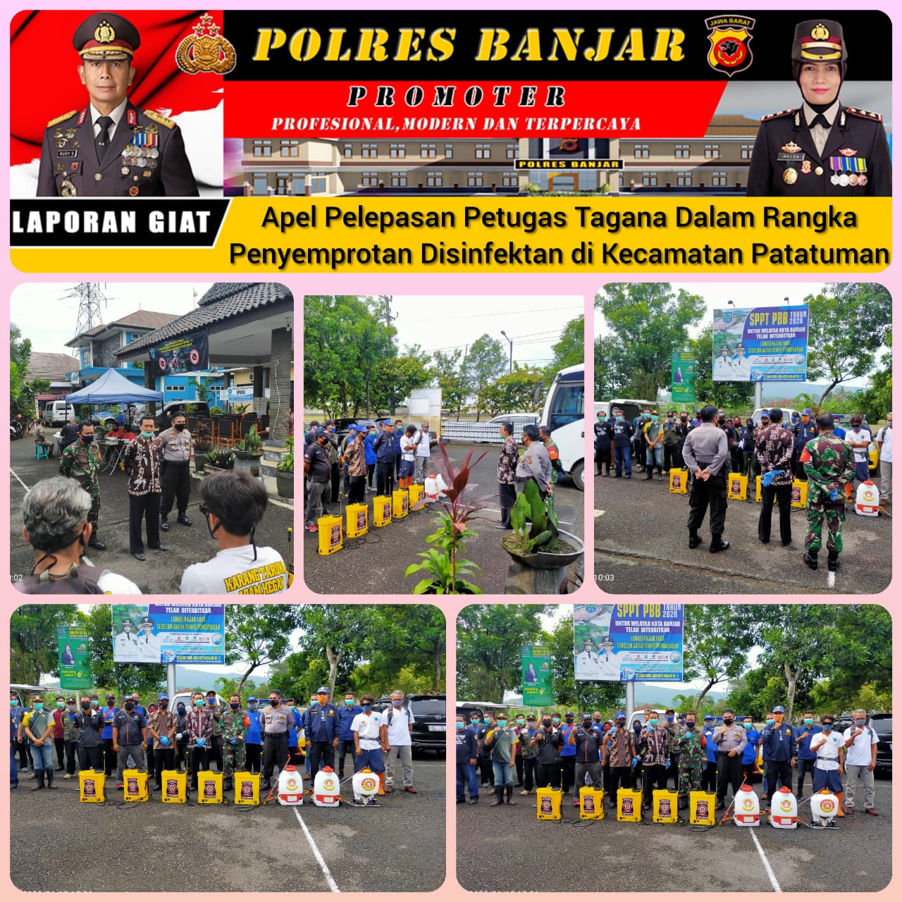 Sebelum pelepasan dimulai diawali apel personil, pengecekan peralatan (APD. Kapolsek Pataruman mengutarakan Penyemprotan disinfektan oleh petugas tagana yang tergabung dalam Gugus Tugas Covid 19 Tingkat Kecamatan Pataruman menyasar ke tempat – tempat / fasilitas umum seperti Mushola / Mesjid maupun tempat ibadah Gereja dengan maksud dan tujuan untuk mencegah penyebaran virus covid 19 diwilkum Kecamatan Pataruman dalam rangka penerapan Adaptasi Kebiasaan Baru (AKB) New Normal ungkap AKP Cecep Edi Sulaeman, S.IP.