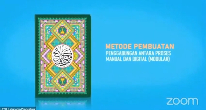 Dalam kesempatan yang sama Ramadani selaku ketua Umum MTQ XXXVIII menjelaskan, detail Pembuatan Mushaf Al-Qur’an Khas Pandeglang tersebut. Pembuatannya menggunakan metode modular yaitu, penggabungan antara manual dan digital, proses pembuatan iluminasi dikerjakan secara digital. Sedangkan tulisan/khat dikerjakan dengan tulis tangan”, Jelasnya.
