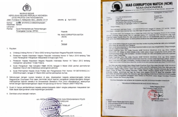 Ketua LSM Nias Corruption Watch (NCW) apresiasi sikap tegas Pimpinan Polri melalui surat dari Mabes Polri Devisi Profesi dan Pengamanan nomor :B/89-b/IV/WAS.2.4/2022/DivPropam tanggal 06/04/2022 kepada LSM NCW perihal Surat Pemberitahuan Perkembangan Penanganan Dumas (SP3D).
