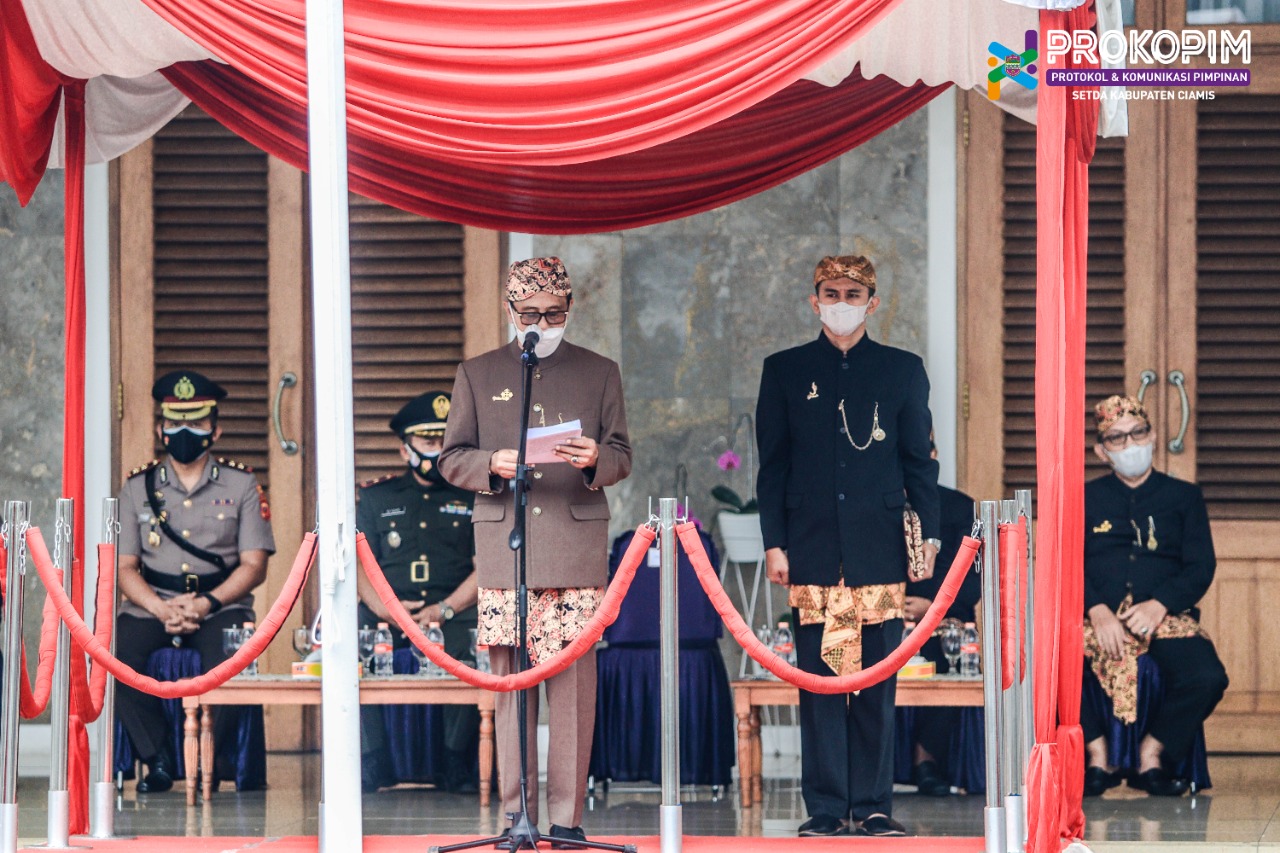 Berita Pemkab Ciamis–, Bupati Ciamis, Herdiat Sunarya, memimpin upacara peringatan Hari Sumpah Pemuda ke- 93 tingkat Kabupaten Ciamis bertempat di halaman Pendopo Bupati, Kamis (28/10/2021).