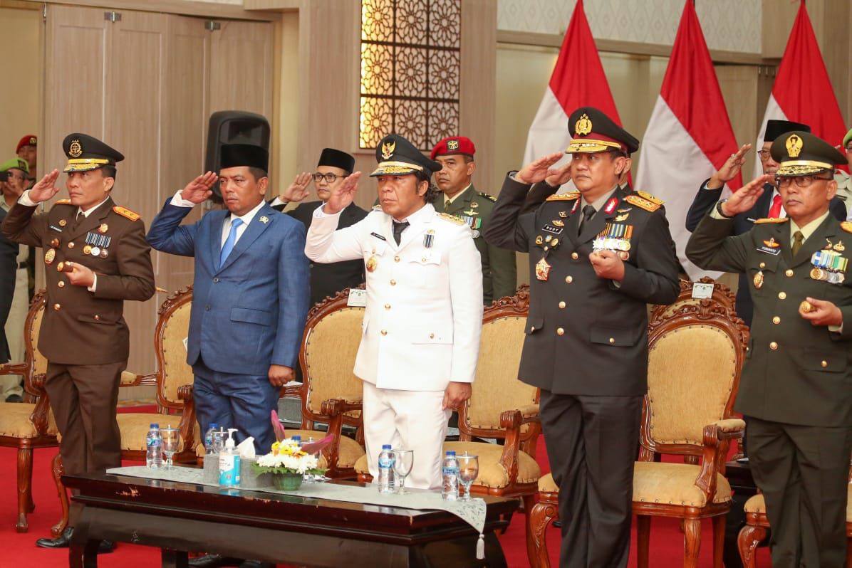 Baraknews Banten–Penjabat (Pj) Gubernur Banten Al Muktabar bersama Forkopimda Provinsi Banten mengikuti Upacara Peringatan Detik-Detik Proklamasi Kemerdekaan Republik Indonesia Ke-77 Tahun 2022 di Istana Merdeka secara virtual dari Pendopo Gubernur Banten, KP3B Curug, Kota Serang, Rabu (17/8/2022).