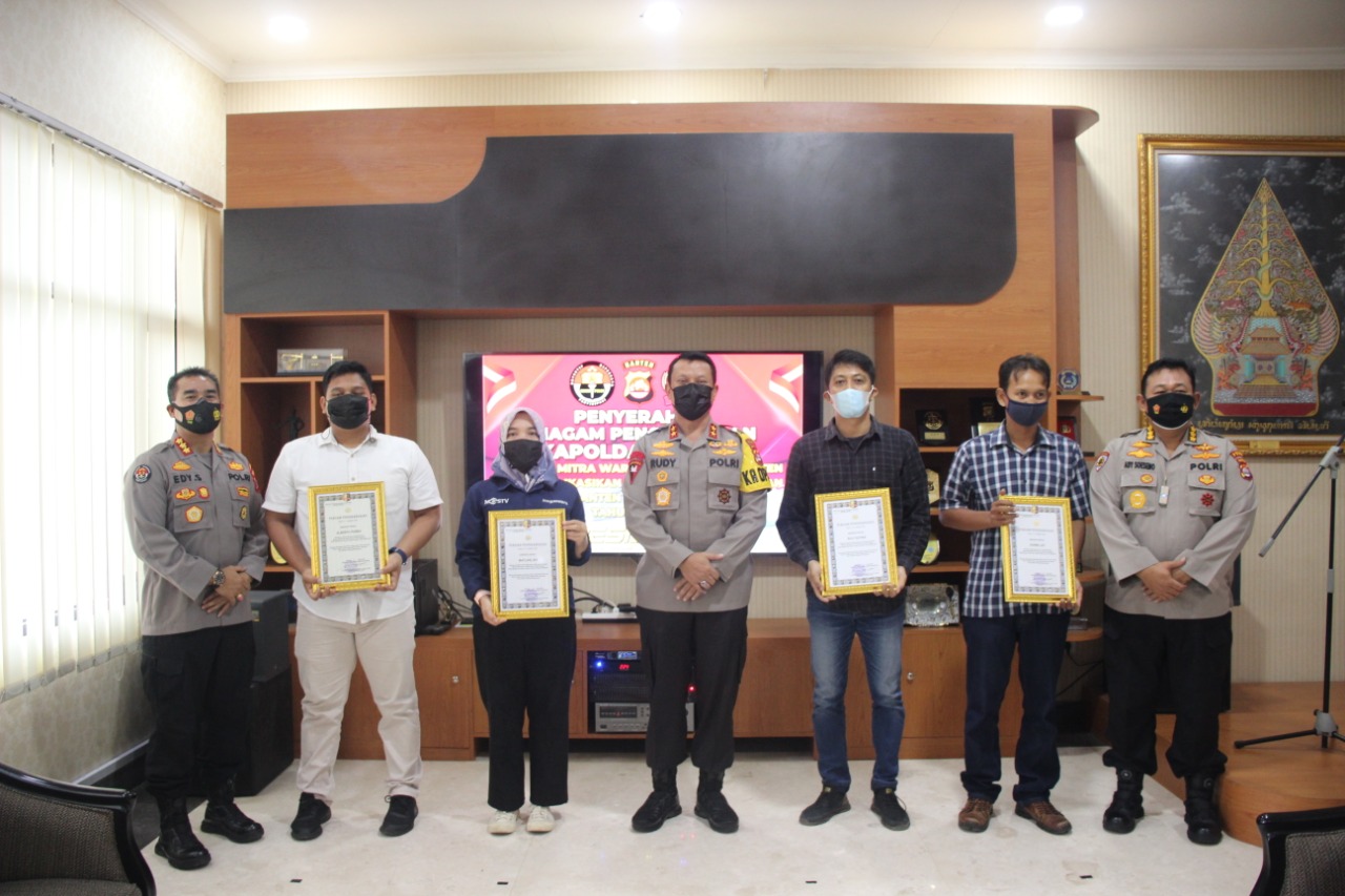 Berita Polda Banten– Sebagai Wujud Apresiasi Kepada Kemitraan Polri dan Insan Pers Mitra Strategis Polri, Kapolda Banten Irjen Pol Dr. Rudy Heriyanto Adi Nugroho SH.,M.H.,M.B.A. Berkenan Memberikan Sertifikat Piagam Penghargaan Kepada 182 Media Massa dari berbagai daerah di Indonesia atas partisipasi dan kerjasama dalam Pemberitaan selama ini, khususnya memberitakan tentang Kegiatan pelayanan masyarakat oleh Polda Banten Dan Polres Jajaran Tahun 2020/2021.