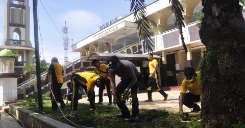 Waka Polres Banjar Kompol Drs Ade Najmulloh membaur dengan para personel. Tak segan, ia menyapu halaman Masjid serta membersihkan sampah yang ada.