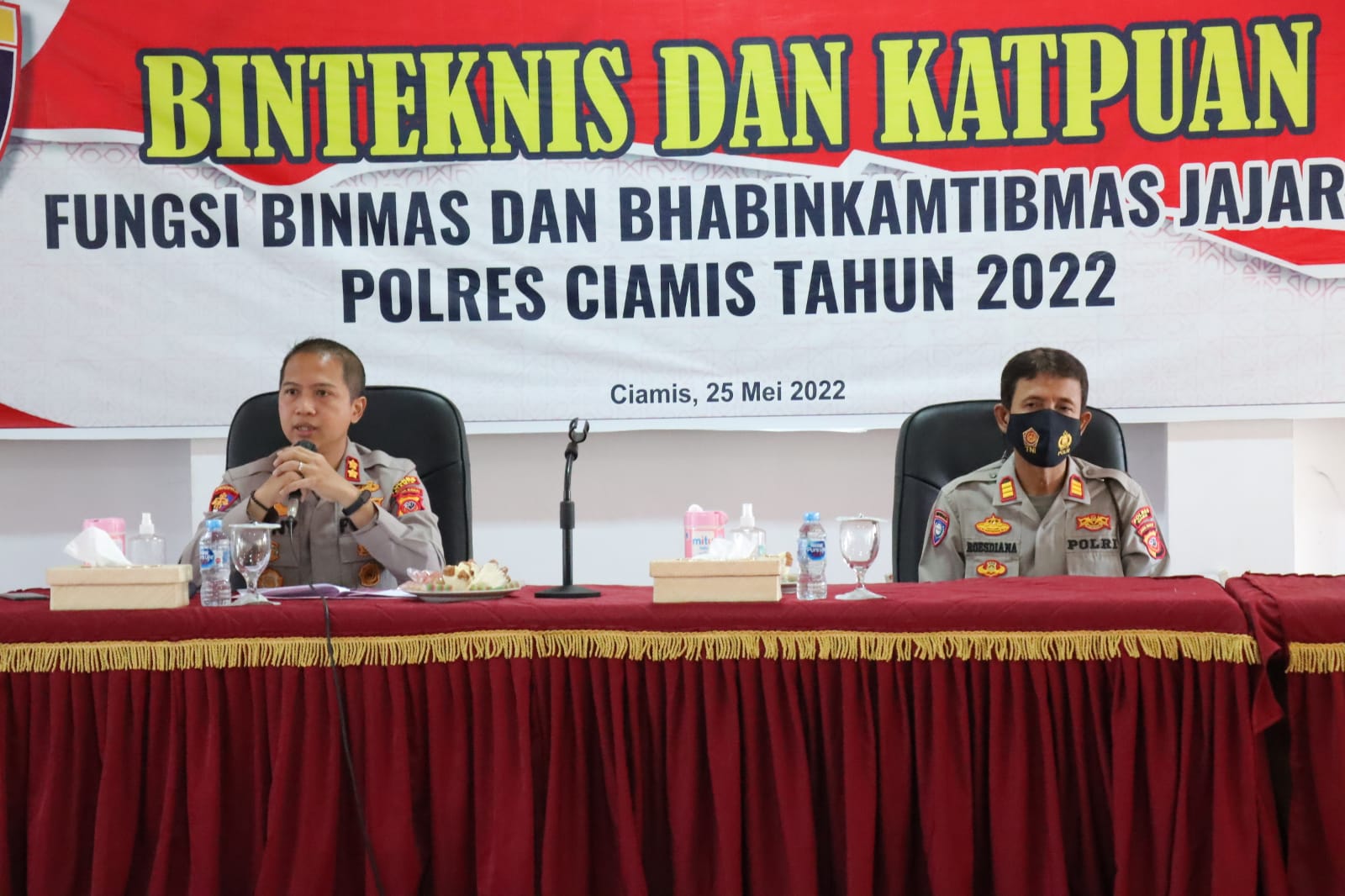 Binteknis dan Katpuan tersebut dihadiri langsung oleh Kapolres Ciamis AKBP Tony Prasetyo Yudhangkoro, SH., S.I.K., M.T., dan Kasat Binmas Polres Ciamis AKP Roesdiana. Kegiatan tersebut diikuti oleh seluruh anggota Binmas dan Bhabinkamtibmas jajaran Polres Ciamis.