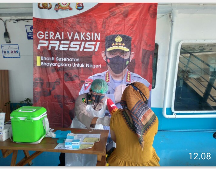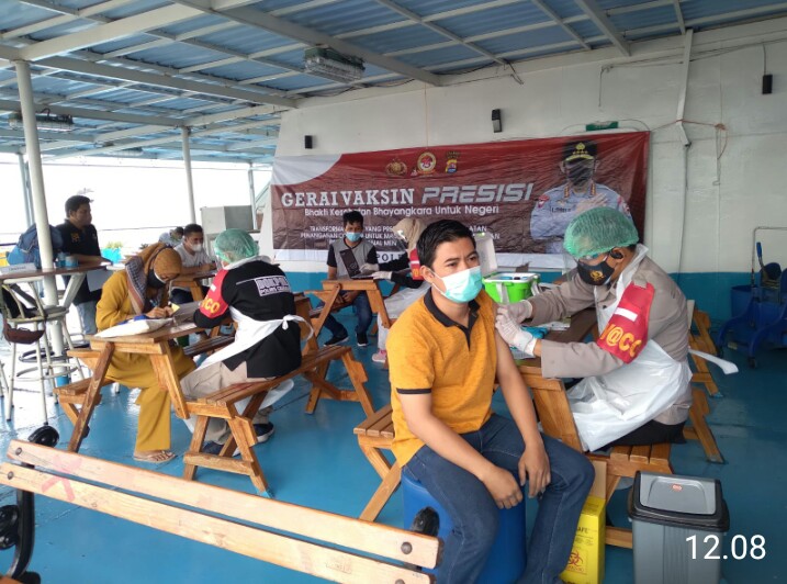 “kami Polres Cilegon Polda Banten mengadakan kegiatan gerai vaksinasi presisi yang mana kami menjaring untuk para sopir truk,anak buah kapal dan pengguna jasa kapal yang belum ter vaksin bisa divaksin di atas,” ujarnya