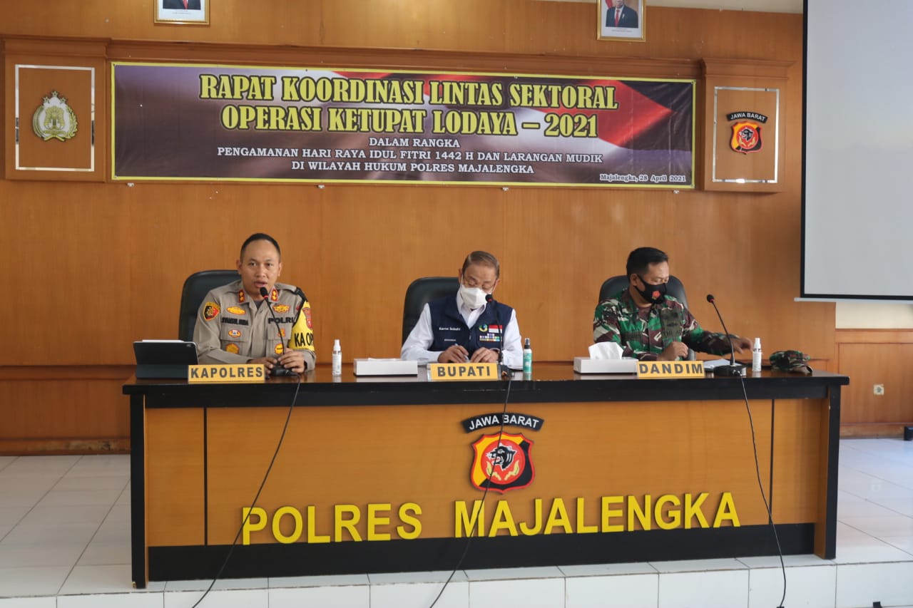 Berita Polres Majalengka–, Dalam menghadapi mudik Idul Fitri, Polres Majalengka bersama Forkopimda menggelar Rapat Koordinasi (Rakor) Lintas Sektoral dalam rangka kesiapan menjelang Pengamanan Ops Ketupat Lodaya Tahun 2021 diwilayah hukum Polres Majalengka, bertempat di Aula Kanya Wasistha Polres Majalengka, Rabu (28/4/2021).