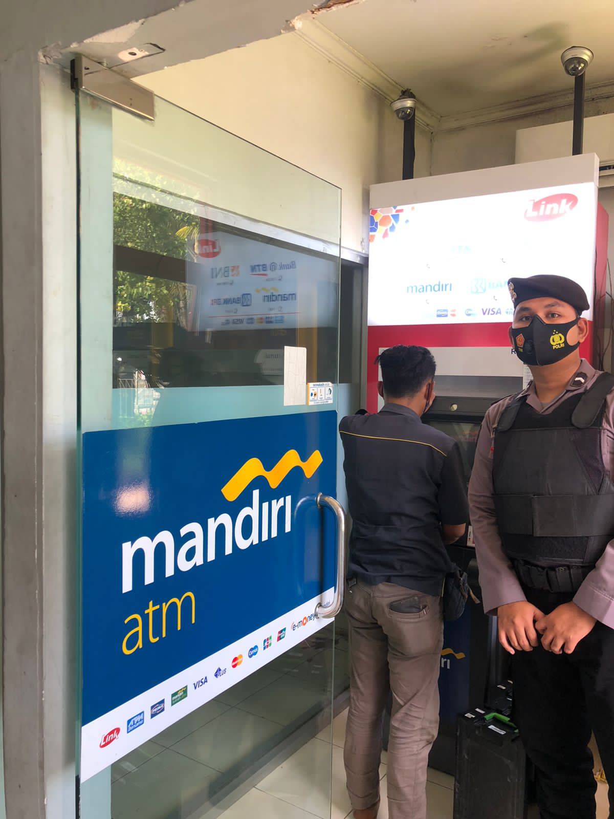 Bripda Dede Firmansyah Personel Sat Samapta Polres Serang Polda Banten memberikan pengawalan kepada petugas pengisian ATM dari PT UG MANDIRI.