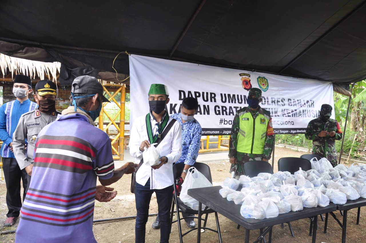 “Saat pembagian makan gratis, warga diwajibkan menggunakan masker dan mencuci tangan terlebih dahulu sebelum mengambil makan gratis yang telah disediakan Polres Banjar. Ini bertujuan agar masyarakat dapat mematuhi dan menerapkan arahan pemerintah maupun Maklumat Kapolri,” jelasnya.