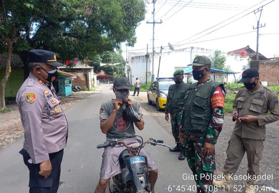 Berita MaPolres Majalengka–, Dalam rangka pencegahan Covid-19 dan pendisiplinan PPKM (Penerapan Pemberlakuan Pembatasan Kegiatan Masyarakat) dan PSBB (Pembatasan Sosial Berskala Besar) Secara Proporsional Untuk Penanganan Virus Covid–19, Polsek Kasokandel Polres Majalengka bersama Muspika Kasokandel menggelar Ops Yustisi di Jalan raya Depan Koramil Dawuan, Jumat (12/2/2021).