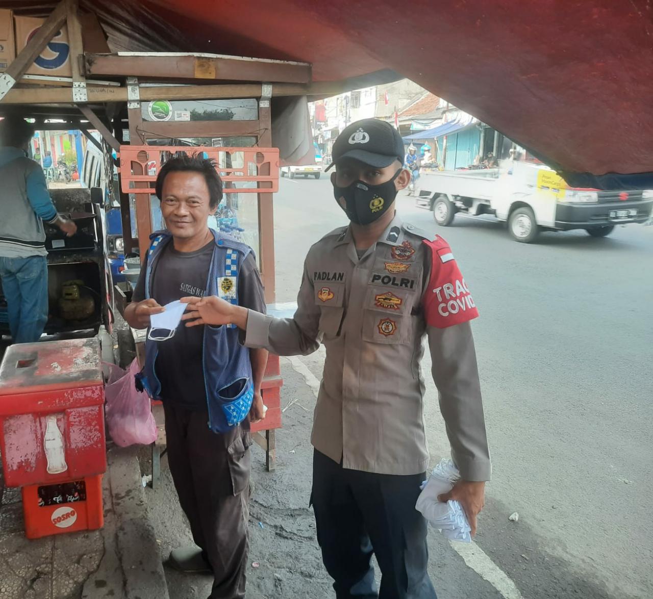 Tak hanya membagikan masker, personil kepolisian juga berbincang dengan warga, untuk melawan informasi hoax dan mencegah gangguan keamanan dan ketertiban di masyarakat.