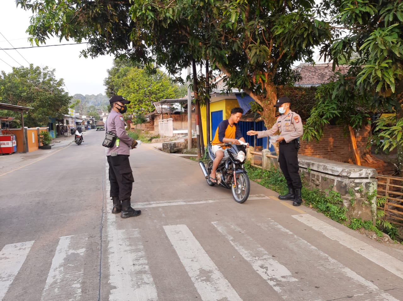 Tampak personel Polsek Padarincang Bripka Oka Muliana, Briptu Yusuf, Bripda Ari, Bripda Danang, membagikan masker kepada warga sekitar dan para pengguna jalan yang melintas didepan Mapolsek Padarincang.