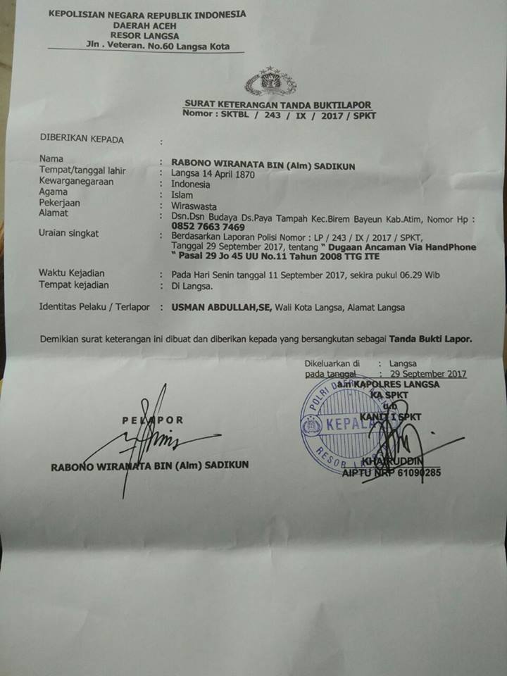 Berdasarkan Laporan Polisi Nomor : LP/243/IX/2017/Aceh/Res Langsa, tgl 29 Sept 2017, tentang ” Dugaan Ancaman Via HandPhone ” Pasal 29 Yo 45 UU Nomor 11 Tahun 2008 tentang ITE.