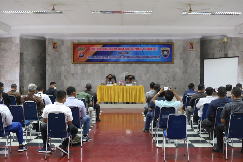 Berita Polres cilegon, Polres Cilegon Polda Banten melaksanakan kegiatan Rapat Koordinasi dalam rangka HUT Satpam Ke 41 Tahun 2021 dengan tema Bersama Polri, Satpam Siap Menjaga Kamtibmas dan penanggulangan Covid19 diaula Serbaguna Polres Cilegon, Rabu, (12/1).