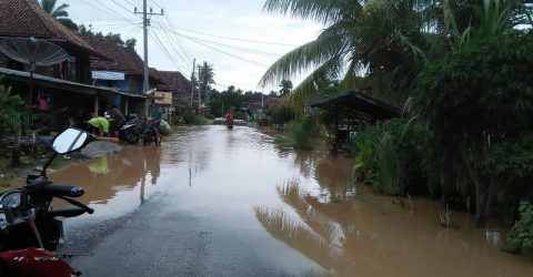 Saat ini ketinggian air mulai tanpak surut yang mana ketinggian air saat pagi tadi hingga pinggang orang dewasa lokasi Jalan Raya Desa Lubar Kecamatan Simpang Kabupaten OKU Selatan.