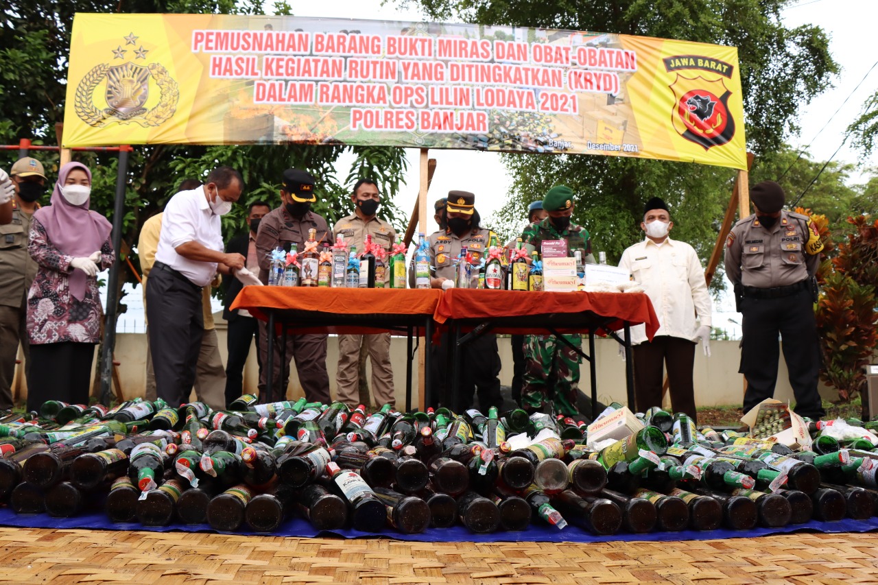 Berita Polres Banjar Polda Jabar – Ribuan Botol Minuman Beralkohol dan Obat-obatan dimusnahkan Dalam kegiatan Pemusnahan Barang Bukti Miras dan Obat-obatan Hasil Kegiatan Rutin yang Ditingkatkan (KRYD) Dalam Rangka Ops Lilin Lodaya 2021 di halaman Mapolres Banjar. (31/12)