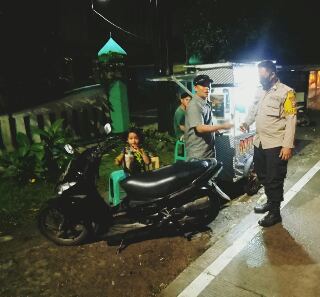 Anggota Polsek Caringin Polres Pandeglang Bripka Eko bersama Bripka Bambang, saat melaksanakan Patroli pada malam hari temui pedagang kaki lima lakukan dialogis sekaligus menghimbau untuk tetap menjalankan protokol kesehatan dengan menggunakan masker dan selalu mencuci tangan memakai sabun dan air yang bersih bertempat di Jln. Desa Carita, Selasa malam (14/12/2022).