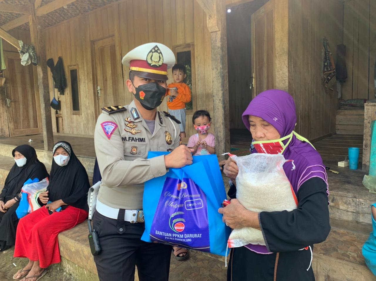 Sat Lantas Polres Pandeglang serahkan bantuan paket sembako bagi warga terdampak PPKM Mikro, paket sembako dibagikan ke masyarakat kurang mampu