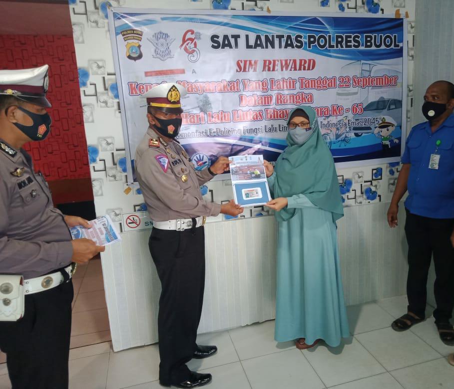 Kasat Lantas Polres Buol Iptu Edi Hafel, mengatakan, bahwa sudah ada empat orang warga masyarakat yang telah kami berikan reward SIM gratis, yang lahir pada tanggal 22 September, bertepatan dengan HUT Lalulintas Bhayangkara ke-65.
