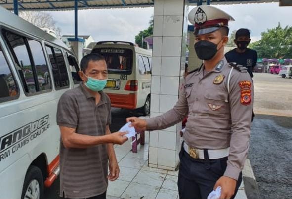 Berita Polres Ciamis – Satuan Lalu Lintas Polres Ciamis Polda Jabar kembali melakukan edukasi protokol kesehatan terhadap warga dengan menempelkan stiker “Ayo Pakai Masker” di sejumlah kendaraan yang melintas di wilayah hukum Polres Ciamis. Penempelan stiker kali ini dilaksanakan di kawasan Terminal Cisaga, Kecamatan Cisaga, Kabupaten Ciamis, Jawa Barat, Rabu (21/08/2021).