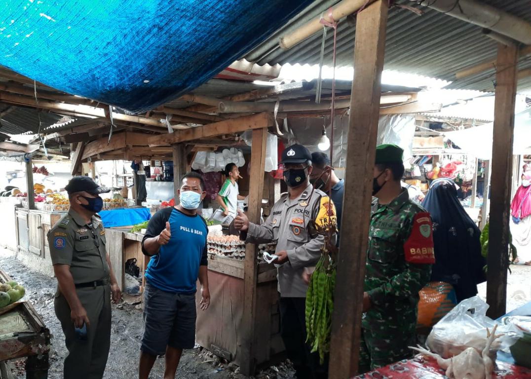 Memberikan sosialisasi kepada pengunjung pasar, warga yang berkerumun diingatkan untuk menjaga jarak, menghimbau keamanan dan prokes kepada pemilik kios serta pedagang kaki lima dan masyarakat dilokasi.
