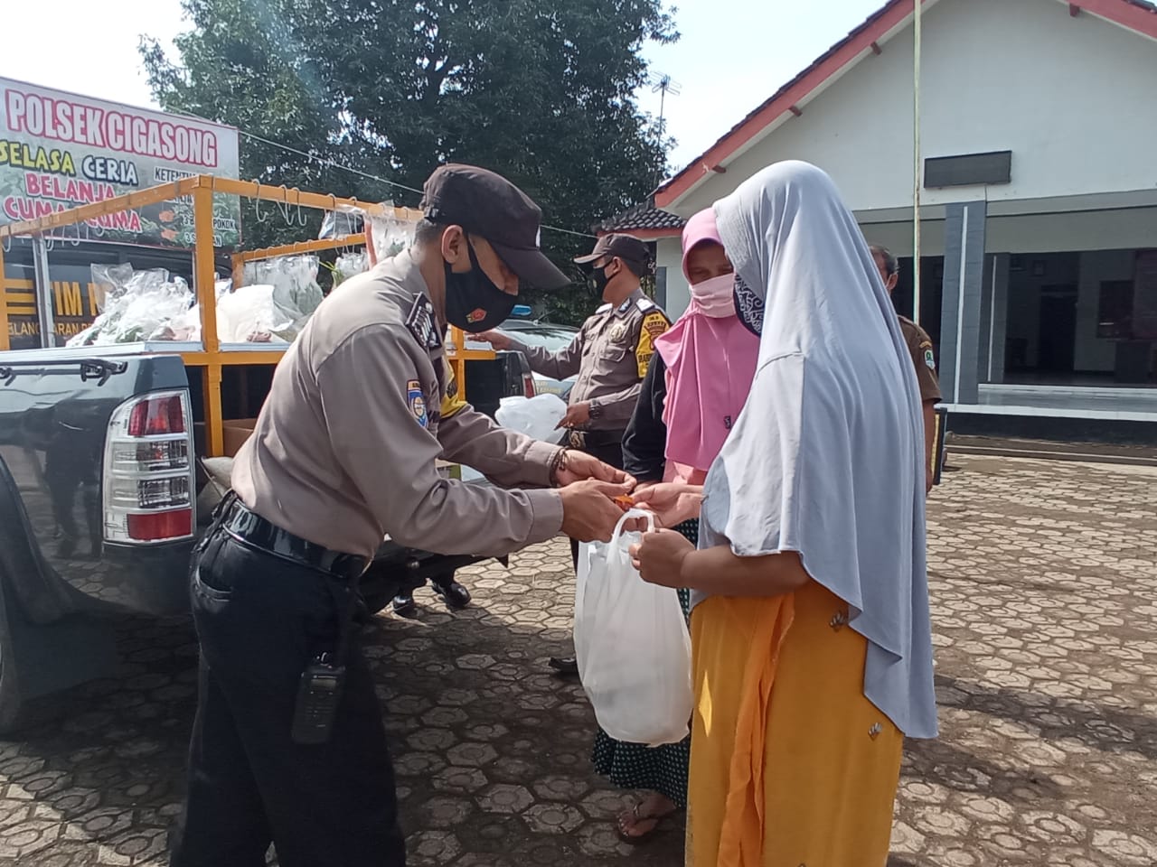 Selasa Ceria Belanja Cuma Cuma, Polsek Cigasong Bagikan Puluhan Paket Sembako Dan Masker Kepada Warga