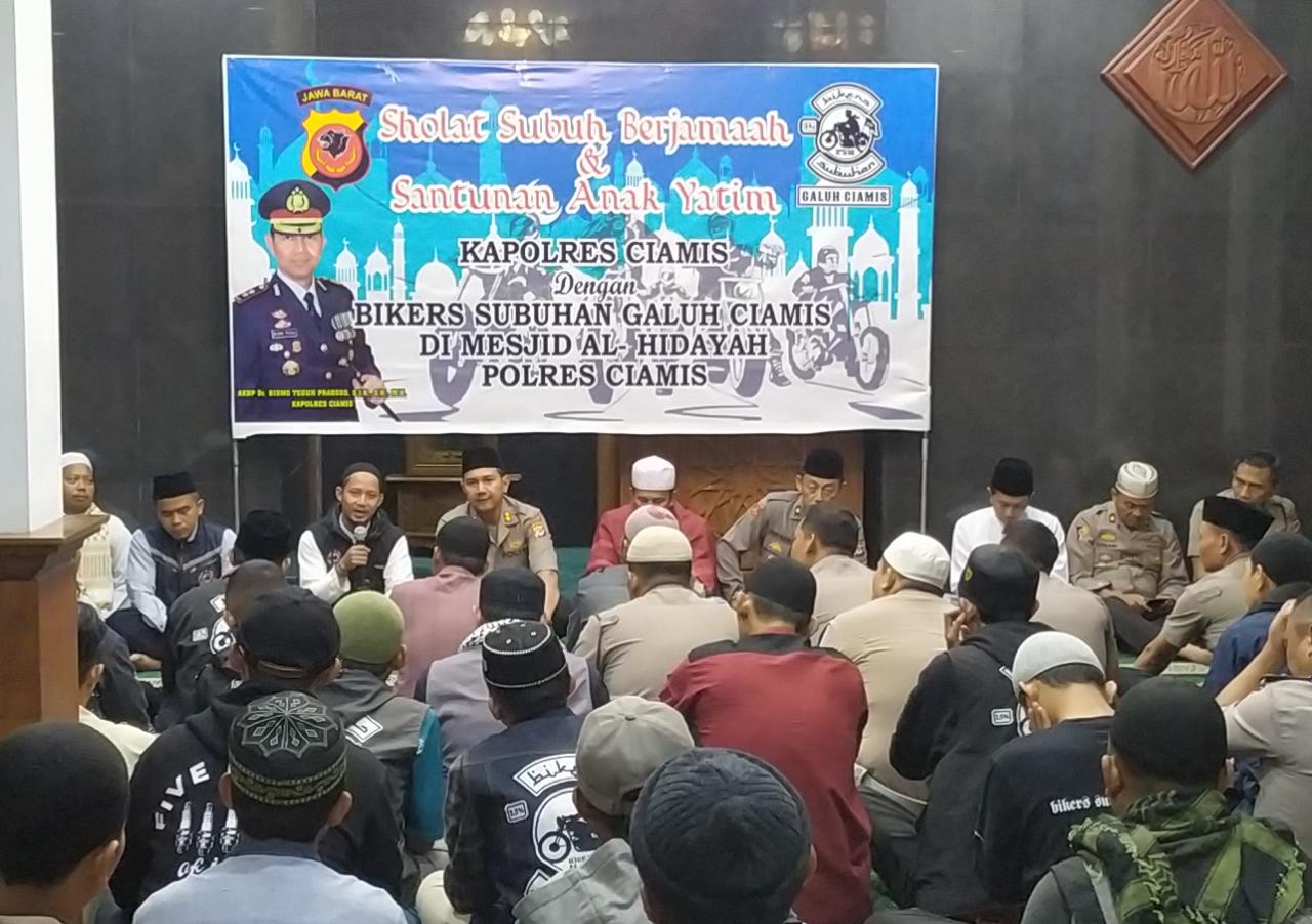 Pelaksanaan kegiatan solat subuh berjamaah dan santunan anak yatim Kapolres Ciamis dengan Bikers Subuhan Galuh Ciamis (BSGC) dalam rangka mempererat tali silaturahmi dan mempertebal keimanan dan ketaqwaan terhadap Allah.