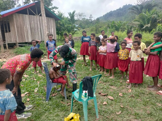 Baraknews Keerom–Sebagai wujud kepedulian kepada anak-anak perbatasan untuk menanamkan kerapian sejak dini kepada anak-anak perbatasan, personel Satgas Pamtas RI-PNG Yonif 126/KC Pos Tatakra menggelar pangkas rambut anak-anak SD Inpres Fafinimbo Kampung Tatakra, Distrik Web, Kabupaten Keerom.