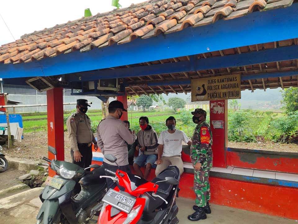 Bhabinkamtibmas Polsek Argapura bersama Koramil Argapura bersinergi menyambangi Pangkalan ojek mensosialisasi 5M memberikan himbauan Pencegahan Covid-19 dan memberikan masker gratis kepada warga yang berkerumun serta pengguna jalan agar selalu menerapkan 3M guna pencegahan Covid-19.