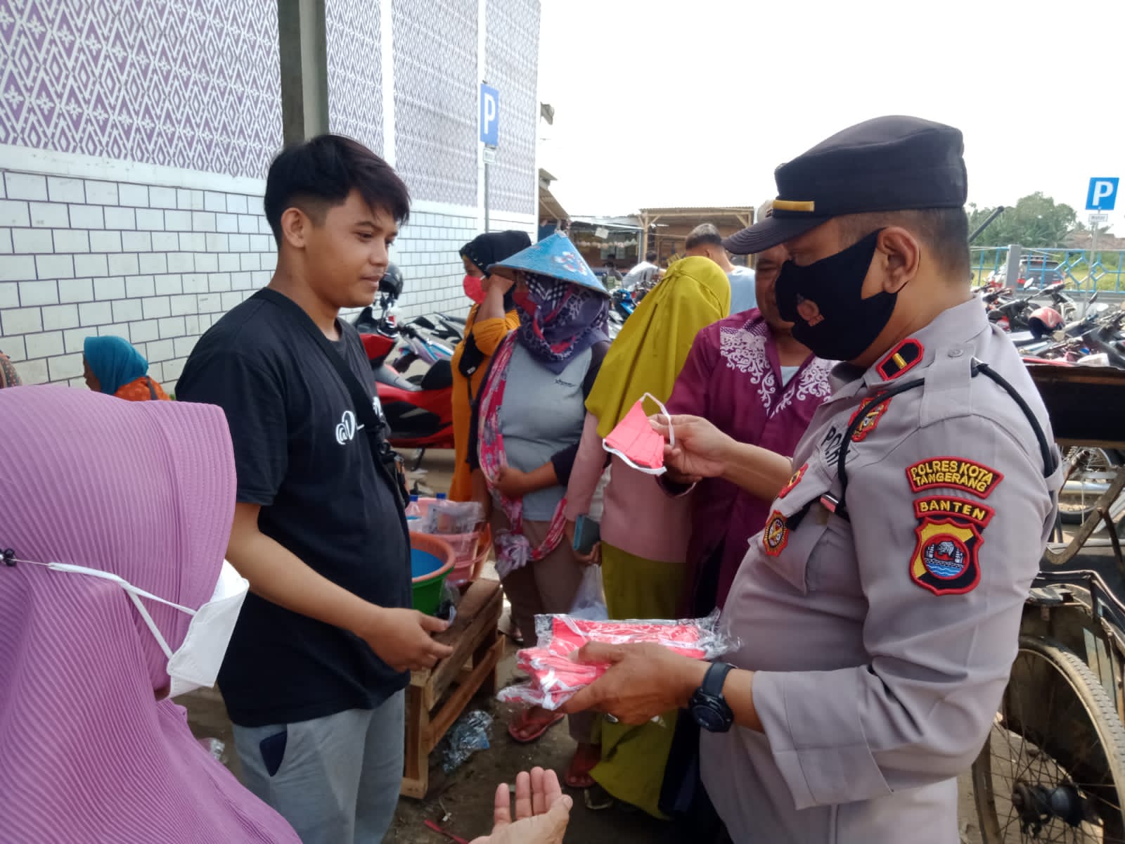 Salah satu intens melaksanakan kegiatan bagi-bagi masker untuk warga dan pedagang di Pasar Tradisional Mauk, Kelurahan Mauk Timur, Kecamatan Mauk, Kabupaten Tangerang, Senin (8/11/2021).