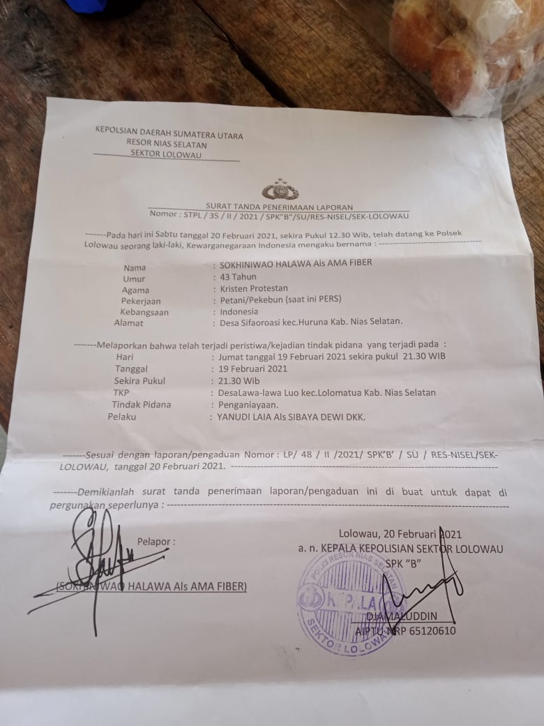 Hal ini berdasarkan Laporan tersebut yang telah diterima Polsek Lolawau dengan Nomor : STPLP /35/II/2021/SPK”B”/SU/Res-Nisel/Sek-lolowau, dengan Delik tidak Pidana Penganiayaan