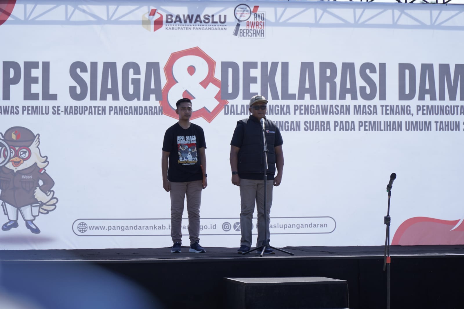 Apel siaga ini dilaksanakan dengan tujuan bukti kepada masyarakat di Kabupaten Pangandaran bahwa Bawaslu Pangandaran siap melaksanakan tugas pengawasan pemilu tahun 2024 khususnya di masa tenang hingga pemungutan dan penghitungan suara nantinya,” Kata Ketua Bawaslu Pangandaran, Iwan Yudiawan dalam arahannya.