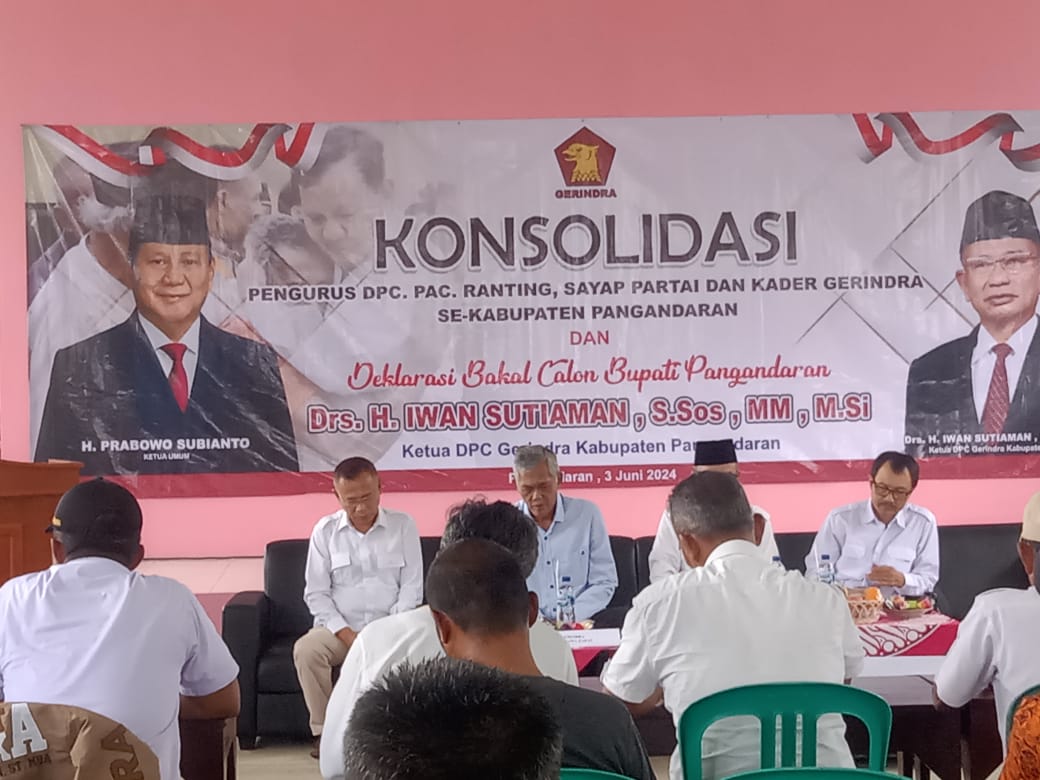 Pilkada Pangandaran–DPC Partai Gerindra Kabupaten pangandaran menggelar rapat konsolidasi pemenangan Pemilihan Umum Kepala Daerah Tahun 2024 dan Deklarasi Calon Bupati pangandaran dari partai gerindra yang dilaksanakan di salah satu Rumah makan di daerah Citumang pangandaran Senin (03 06 2024).