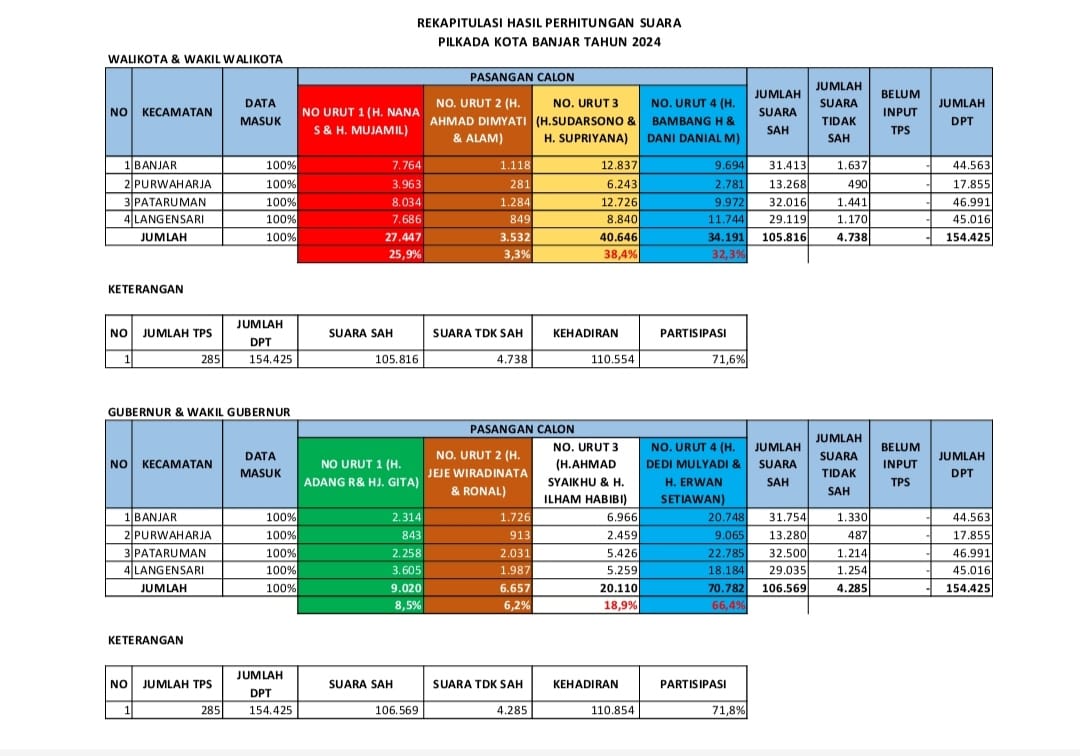 KPU Kota Banjar mengucapkan terima kasih kepada seluruh pihak yang telah mendukung terselenggaranya Pilkada Serentak Tahun 2024, serta kepada masyarakat yang telah berpartisipasi aktif dalam menggunakan hak pilihnya.( Acep Surya )