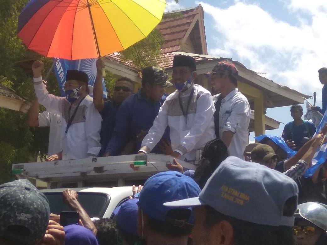 Berita Pilkada Bima NTB —- Massa yang tergabung dari berbagai Kecamatan yang ada di Kabupaten Bima antara lainnya yakni ; Kecamatan Woha, Monta, Parado, Bolo, Sape, Ambalawi, Wera, Lambu, Madapangga, Soromandi dan Donggo mengantarkan & mendampingi pendaftaran Calon Bupati (Cabul) Drs. H. Syafruddin H. M. Nur, M. Pd, Calon Wakil Bupati Bima (Cawabup) Bima, Ady Mahyudi atau yang dikenal dengan singkatan (Syafa’ad), Minggu, 06/09/20 di Komisi Pemilihan Umum (KPU) Kabupaten Bima Desa Panda Kecamatan Palibelo.