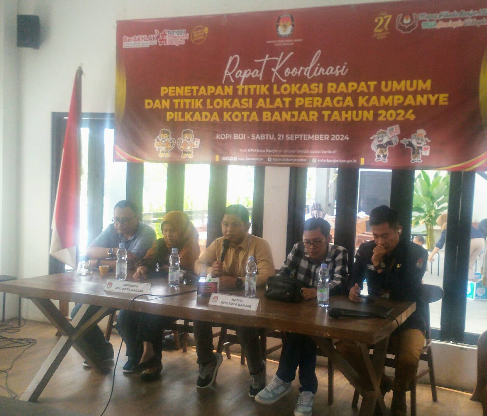 Pilkada Kota Banjar– Komisi Pemilihan Umum (KPU) Kota Banjar mengadakan acara rapat koordinasi penetapan titik lokasi rapat umum dan titik lokasi alat peraga kampanye pilkada kota banjar tahun 2024 Acara berlangsung di salah satu room cape dikota Banjar dan dihadiri oleh berbagai stakeholder, termasuk perwakilan dari partai politik, pengawas pemilu, serta masyarakat.